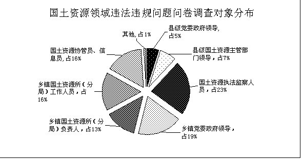 这次调查覆盖全国31个省(区、市)和新疆生产建设兵团,共收回调查问卷3202份。调查对象来自不同层面,166人为县级党委、政府领导,约占5%;221人为县级国土资源主管部门领导,约占7%;725人为国土资源执法监察人员,约占23%;623人为乡(镇)党委、政府领导,约占19%;421人为乡(镇)国土资源所(分局)负责人,约占13%;515人为乡(镇)国土资源所(分局)工作人员,约占16%;501人为国土资源协管员、信息员,约占16%;其他约占1%。