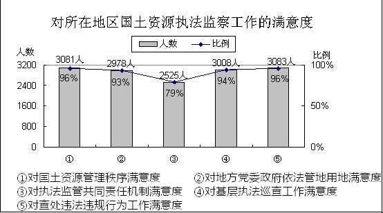 调查对象对所在地区国土资源执监察工作满意度较高。3081人(约占96%)对所在地区国土资源管理秩序的评价是“非常满意”或“基本满意”;2978人(约占93%)对所在地区党委、政府依法依规管理和利用国土资源情况的评价是“非常满意”或“基本满意”;2525人(约占79%)认为,所在地区建立了政府主导、部门联动的执法监管共同责任机制,协作联动效果较好;3008人(约占94%)对所在地区基层国土资源所(分局)巡查工作和对违法用地发现、制止情况的评价是“非常满意”或“基本满意”;3083人(约占96%)对所在地区国土资源主管部门查处各类违法违规行为的公开、公平、公正情况及查处效率的评价是“非常满意”或“基本满意”。