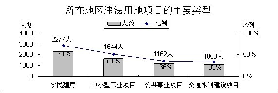 关于所在地区违法用地项目的主要类型(多选题),2277人(约占71%)选择“农民建房”;1644人(约占51%)选择“中小型工业项目”;1162人(约占36%)选择“公共事业项目”;1058人(约占33%)选择“交通水利等基础设施建设项目”。