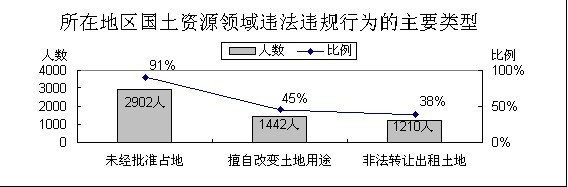 关于所在地区国土资源领域违法违规行为的主要类型(多选题),2902人(约占91%)选择“未经批准非法占用土地”;1442人(约占45%)选择“擅自改变土地用途”;1210人(约占38%)选择“非法转让、出租土地”。