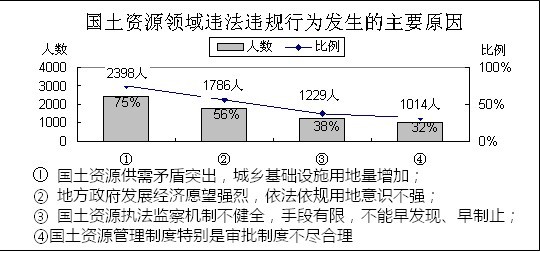 关于所在地区国土资源领域违法违规行为发生的主要原因(多选题),2398人(约占75%)认为,国土资源供需矛盾突出,城乡基础设施用地量增加;1786人(约占56%)认为,地方政府发展经济愿望强烈,依法依规用地意识不强;1229人(约占38%)认为,国土资源执法监察机制不健全,手段有限,不能及时发现并制止违法行为;1014人(约占32%)认为,国土资源管理制度特别是审批制度不尽合理。