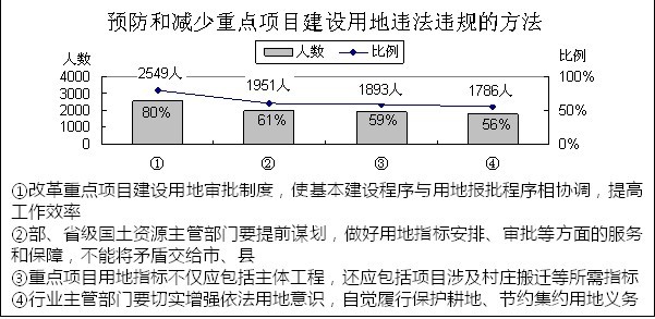 关于如何查处国家和省级重点工程项目建设未经批准先行占地开工,1814人(约占57%)认为,必须严格查处,重大工程项目有示范效应;928人(约占29%)认为,只要存在违法就要查处,但可以从宽处理。关于如何有效预防和减少国家和省级重点工程项目建设违法违规用地行为(多选题),2549人(约占80%)认为,要改革重点工程项目建设用地审批制度,使基本建设程序与用地报批程序相协调,提高工作效率;1951人(约占61%)认为,部、省级国土资源主管部门要提前谋划,做好用地指标安排、审批等方面的服务和保障,不能将矛盾交给市、县;1893人(约占59%)认为,重点工程项目建设用地指标,不仅应包括主体工程,还应包括项目所涉及的村庄搬迁等所需的指标;1786人(约占56%)认为,行业主管部门要切实增强依法用地的意识,自觉履行保护耕地、节约集约用地的义务。