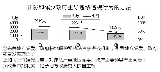 关于如何查处政府主导的国土资源领域违法违规问题,2395人(约占75%)认为,政府主导违法应严肃查处,纠正违法行为的同时,要追究有关责任人的责任。关于如何有效预防和减少政府主导的国土资源领域违法违规行为(多选题),2519人(约占79%)认为,要完善地方党委、政府耕地保护和执法监察考核机制,引导地方党委、政府转变发展理念;2261人(约占71%)认为,要加大案件曝光力度,对违法严重地区的党委、政府主要领导严肃问责;1439人(约占45%)认为,要改革审批制度,给予地方政府更大的自主权。