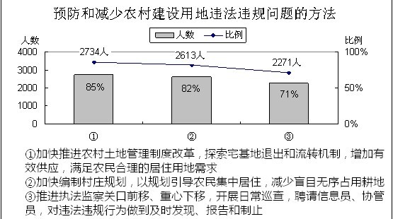 关于如何查处农村建设用地违法违规问题(多选题),2843人(约占89%)认为,严肃查处的同时要因势利导,帮助农民解决用地矛盾。关于如何有效预防和减少农村建设用地违法违规行为(多选题),2734人(约占85%)认为,要加快推进农村土地管理制度改革,探索农民宅基地退出和流转机制,增加有效供应,满足农民合理的居住用地需求;2613人(约占82%)认为,要加快编制村庄规划,以规划引导农民集中居住,减少盲目无序占用耕地;2271人(约占71%)认为,要推进执法监察关口前移、重心下移,开展日常巡查,聘请信息员、协管员,对违法违规行为做到及时发现、报告和制止。