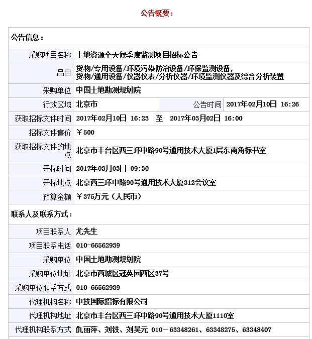 中国土地勘测规划院2017年土地资源全天候遥感监测数据处理与分析项目公开招标公告