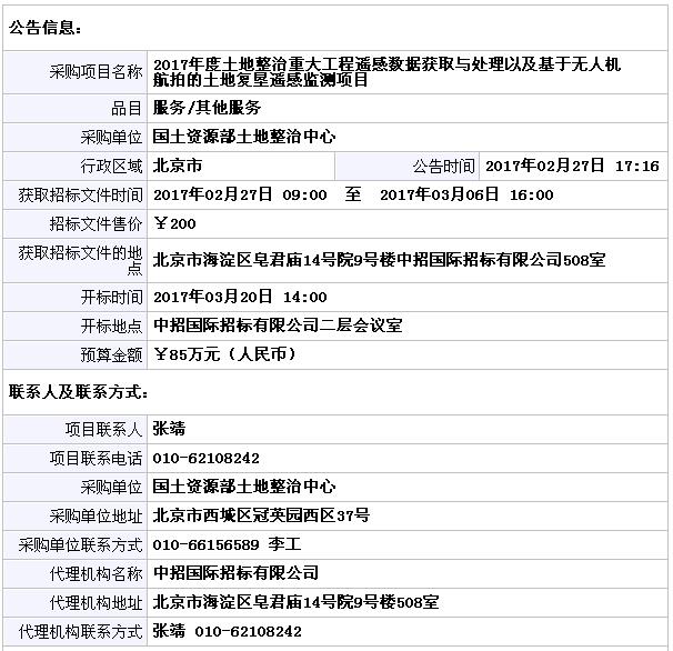 国土资源部土地整治中心2017年度土地整治重大工程遥感数据获取与处理以及基于无人机航拍的土地复垦遥感监测项目公开招标公告