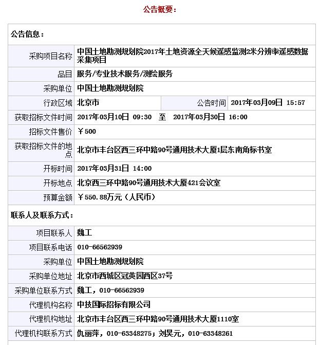 中国土地勘测规划院2017年土地资源全天候遥感监测数据处理与分析项目公开招标公告